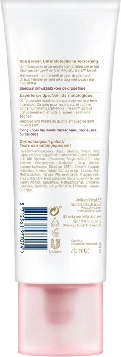 Dove DermaSpa Intensive Handcrème is onderdeel van de Dove DermaSpa lijn. Deze lijn is speciaal ontwikkeld om je thuis een spa-gevoel te geven om zo de drukke werkelijkheid even te kunnen ontvluchten. Als de huid van je handen extreem droog of zelfs gebarsten is, heb je de verzorging van een goede handcrème nodig. Verwen je extreem droge handen met onze speciale Dove DermaSpa Intensive handcrème.