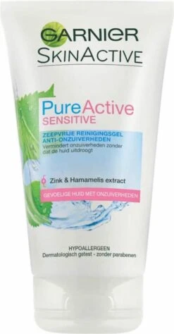 Garnier Pure Active Sensitive Anti-Onzuiverheden ReinigingsgelGarnier SkinActive Pure Active Sensitive Zeepvrije Reinigingsgel is speciaal voor de gevoelige & gemengde tot vette huid met onzuiverheden. Deze reinigingsgel reinigt de huid en vermindert onzuiverheden, zonder dat het de huid uitdroogt. De hypoallergene formule met fysiologisch pH is verrijkt met reinigend zink om onzuiverheden zichtbaar te verminderen en Hamamelis extract om de huid te helpen kalmeren.