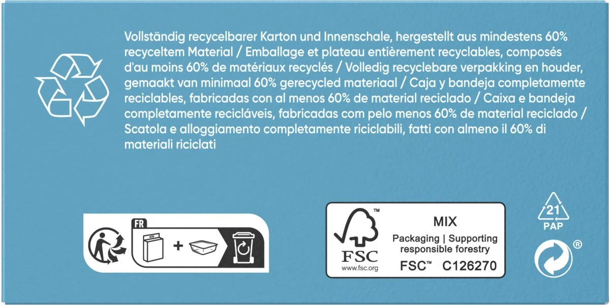 - Volledig recyclebare verpakking: Volledig recyclebaar en gemaakt met minstens 40% gerecyclede materialen. FSC-gecertificeerd