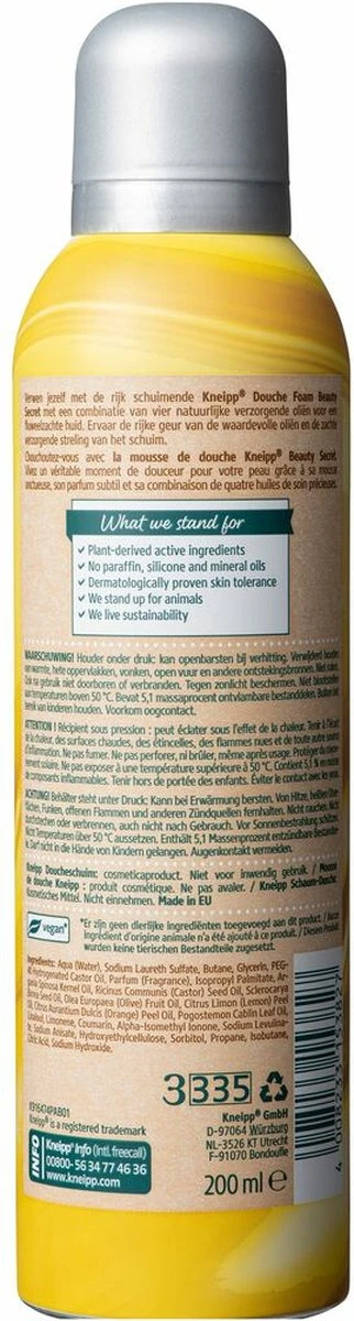Verwen jezelf met de rijk schuimende Kneipp douche foam Beauty Secret met een combinatie van vier natuurlijke verzorgende oliën voor een fluweelzachte huid. en unieke combinatie van vier bijzondere natuurlijke oliën; argan-, marula,- wonderboom- en olijfolie. Deze oliën zijn rijk aan vitaminen, essentiële vetzuren en anti-oxidanten en bieden de perfecte verzorging voor de huid. Ervaar de luxe geurbeleving van de waardevolle oliën en de zachte verzorgende streling van het schuim.