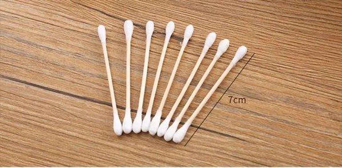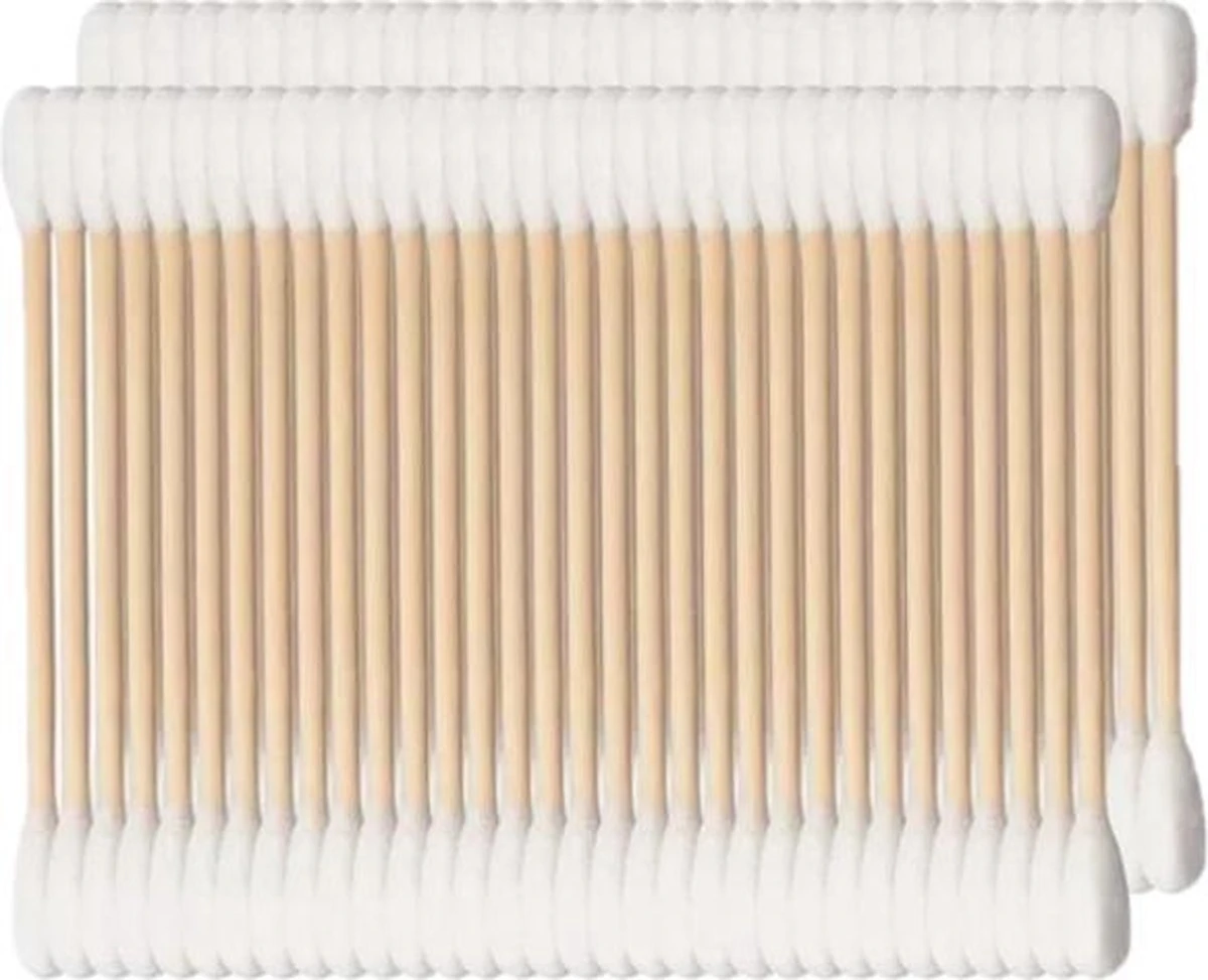 In deze verpakking zitten 2×100 houten wattenstaafjes.