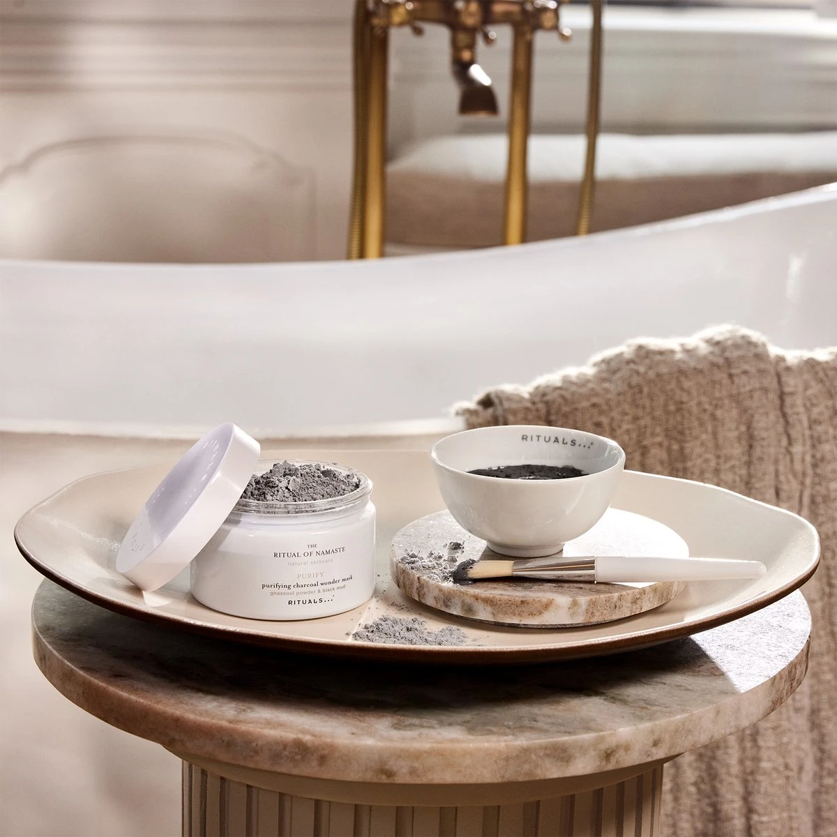 Laat je ware schoonheid zien met deze zuiverende gezichtsbehandeling op basis van ghassoulpoeder en zwarte klei van The Ritual of Namaste. Dit gezichtsmasker bevat natuurlijke ingrediënten, zoals zuivere kaolien en houtskoolpoeder van bamboe, die onzuiverheden aan de huid onttrekken, dode huidcellen verwijderen en celvernieuwing stimuleren.