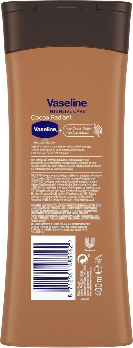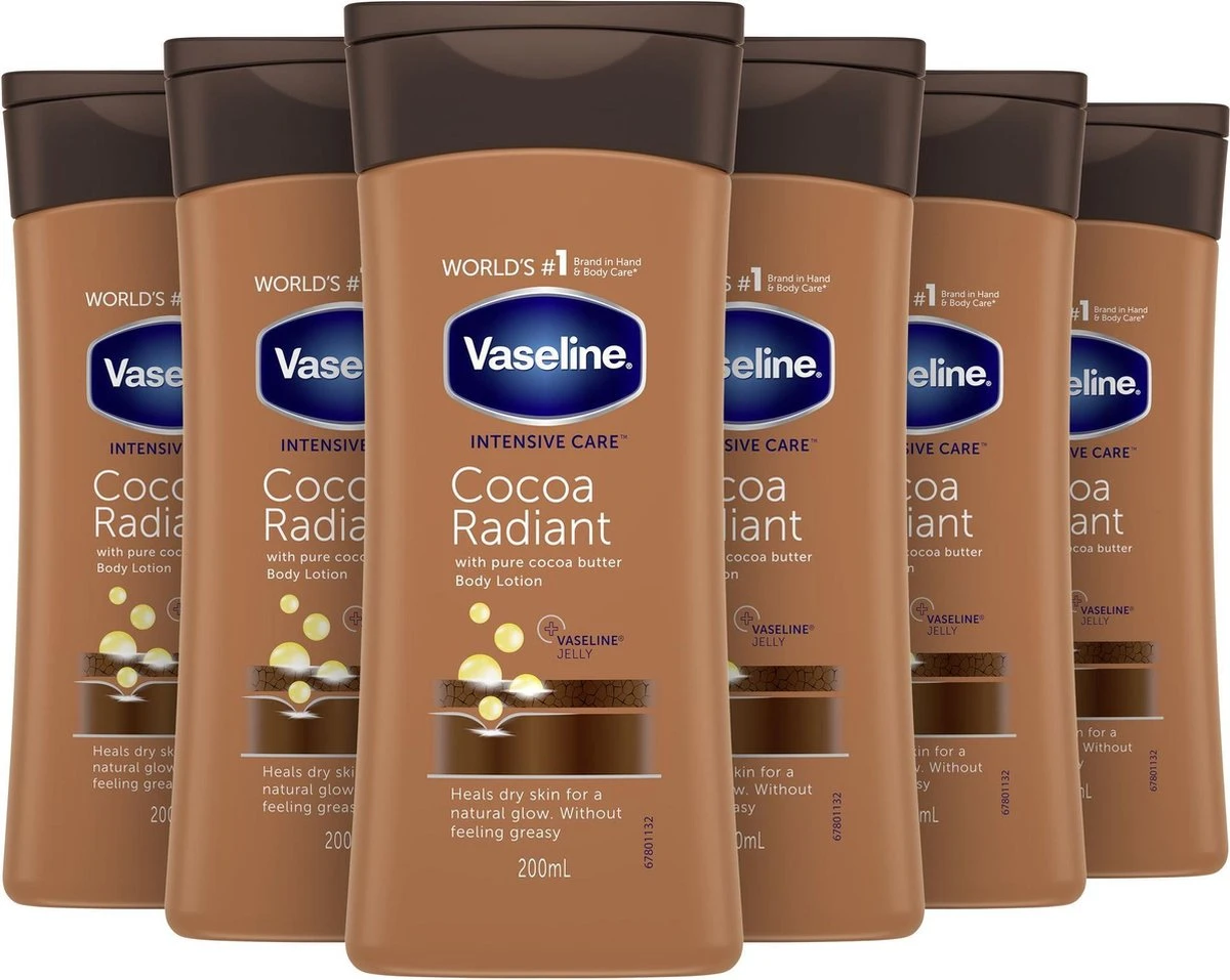 Vaseline Cocoa Radiant Bodylotion van de Intensive Care lijn herstelt en verzacht de droge huid op intensieve wijze, om de natuurlijke glans te onthullen. Deze bodylotion is verrijkt met pure cacaoboter. Dankzij de herstellende werking van dit ingrediënt wordt de huid intens gevoed en behoudt de huid zijn natuurlijke glans. Deze rijke bodylotion bevat vochtinbrengende bestanddelen die de droge- en doffe huid helpen herstellen. Dankzij de hoog geconcentreerde en herstellende ingrediënten van deze verzorgende lotion voelt je huid snel weer zijdezacht aan. Zo kun je je huid extra verzorgen wanneer jij dat nodig hebt. De hydraterende formule begint direct na het aanbrengen te werken. Hierdoor voelt je huid meteen al zachter aan. De lichte bodylotion trekt snel, plakt niet in en voelt niet vet aan; je hoeft dus niet lang te wachten. Vaseline Cocoa Radiant Bodylotion is een herstellende huidverzorging dankzij de toevoeging van microdruppels Vaseline. De Vaseline vormt een beschermend laagje op de huid dat vochtverlies helpt voorkomen, zonder vet aan te voelen. Zo zorgt deze lotion voor een beschermde en herstelde huid. Ook kalmeert de bodylotion de droge, onrustige huid en helpt het jeuk voorkomen. Vaseline is bij velen bekend om de potjes Vaseline Protecting Jelly, en wordt vaak ook wel ‘Wonder Jelly’ genoemd. Vaseline is 150 jaar geleden uitgevonden in Amerika, en staat erom bekend om op een veilige manier de huid te helpen herstellen. Dit potje is de oorsprong van alle Vaseline-producten, waaronder ook deze Vaseline Intensive Care Cocoa Radiant Bodylotion. Voor een optimale huidverzorging kun je ook gebruik maken van andere Vaseline-producten zoals de voedende handcrèmes of de zachte lipcrèmes.
