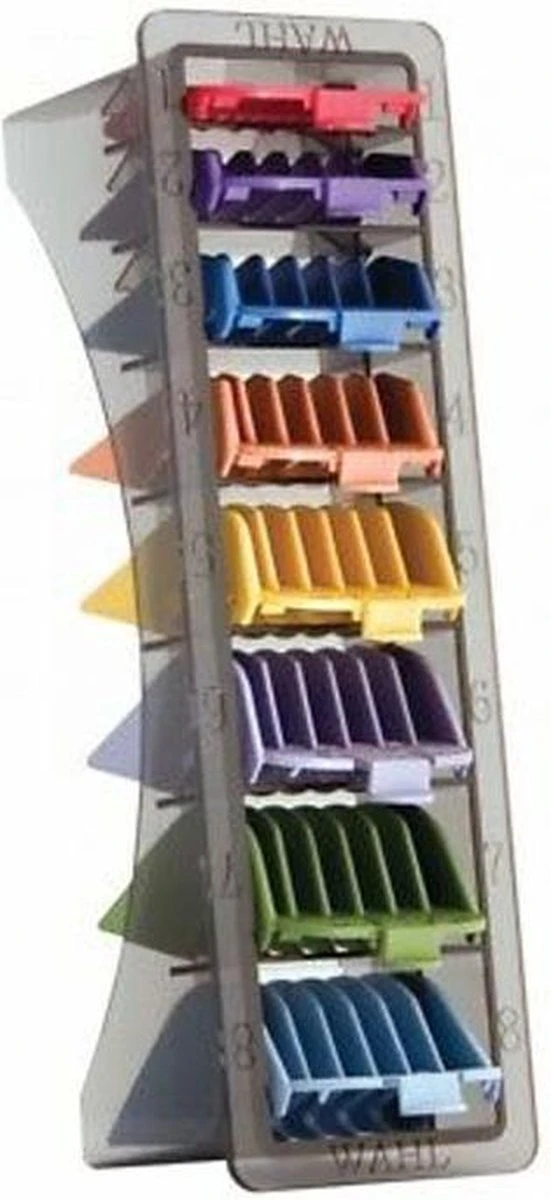 Wahl Set Opzetkammen Gekleurd 3-25mm bevat 8 gekleurde opzetkammen geschikt voor Wahl tondeuses. De set bevat kammen van 3mm, 6mm, 10mm, 13mm, 16mm, 19mm, 22mm en 25mm. Er wordt een gratis organizer bijgeleverd waarin je de opzetkammen makkelijk kan opbergen. Elke kam heeft een eigen kleur, waardoor je makkelijk kan onthouden welke lengte je de vorige keer hebt gebruikt. De opzetkammen passen op de volgende Wahl tondeuses: