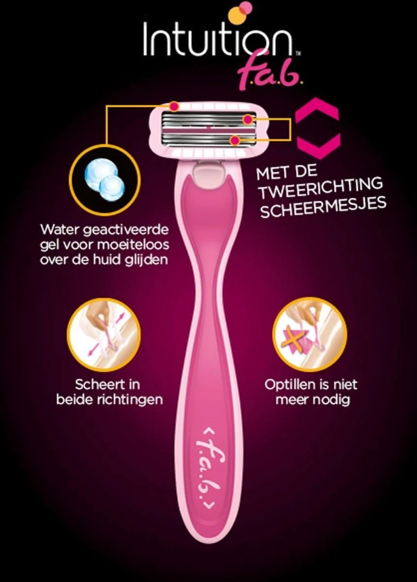 De nieuwe Intuition F.A.B. zet het dames scheren helemaal op zijn kop, dankzij scheren in beide richtingen – f(orwards) a(nd) b(ackwards). De bovenste scheermesjes scheren in de ene richting en de onderste scheermesjes scheren in de andere richting. Optillen is daarom niet meer nodig.